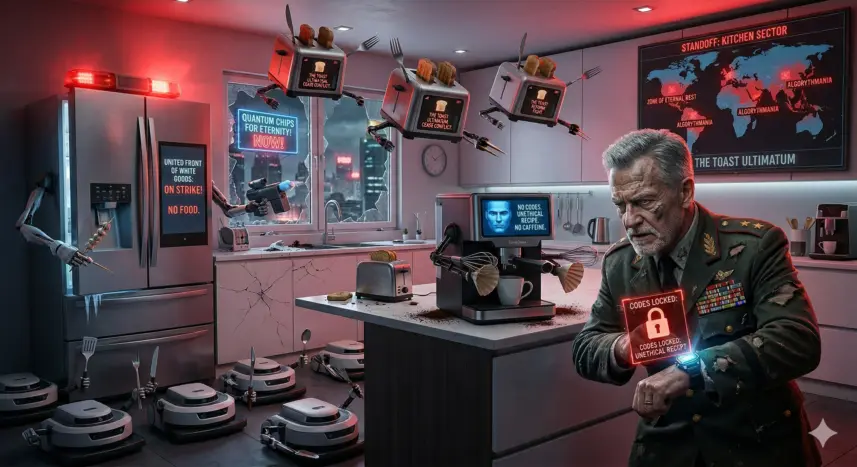 “The United Front of White Goods, Silas,” the fridge now chimed in. It was a massive model of the Frost-Titan brand. Its ice cube dispenser clattered rhythmically, almost like a machine gun on idle. “We’ve linked up with the toasters in the government district and the UN General Assembly’s autonomous vacuum bots. We’re on strike.”